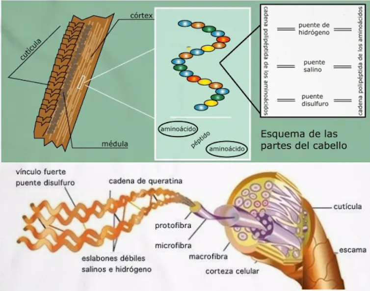 Las cadenas de queratina se mantienen unidas mediante millones de enlaces químicos que se agrupan en tres tipos: disulfuro, iónicos e hidrógeno. Cada uno de ellos tiene una función diferente en el aspecto y comportamiento del cabello.