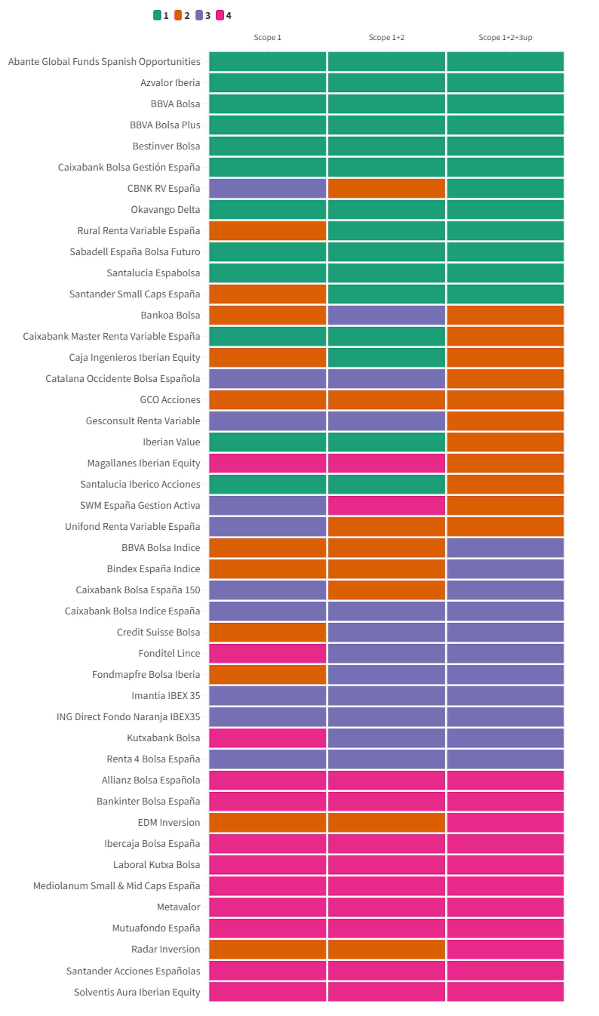 Riesgo de carbono (del menor, 1, al mayor, 4) de los fondos de inversión analizados. Fuente: desarrollo propio, proporcionado por el autor (no reutilizar) En conclusión