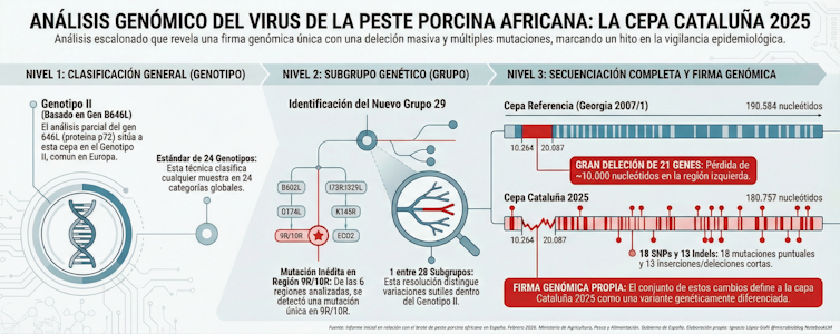 El informe describe la caracterización genética del virus detectado en jabalíes en Cataluña en noviembre de 2025. Debido a que su genoma es grande (unos 170 genes) y muy homogéneo, se aplicó el esquema de caracterización de la Unión Europea. Consiste en un análisis paso a paso (diferentes niveles) que permite aumentar progresivamente la resolución genética para responder a cuestiones epidemiológicas complejas.